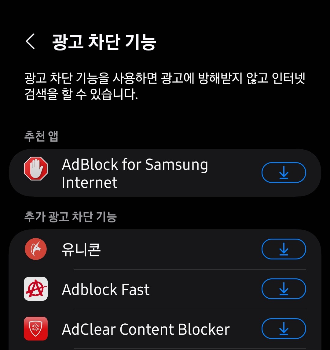 가장 많이 사용하는 건 AdBlock for Samsung Internet입니다.