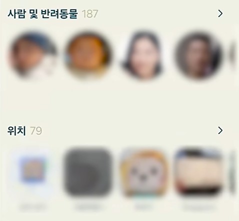‘사람’, ‘동물’, ‘위치’, ‘문서’ 등으로 사진이 자동 분류되어 있습니다.